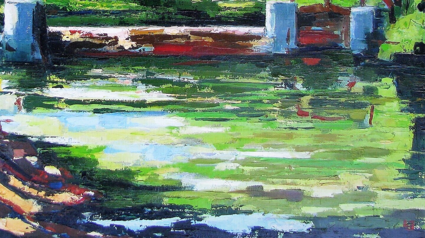 Cette huile a été démarrée sur le motif au printemps et terminée en atelier d'après une aquarelle réalisée sur place. Cet endroit magnifique, ombragé par des platanes centenaires se situe à une centaine de mètres de la source du Lez (résurgence d'une rivière souterraine) juste après le captage qui sert à alimenter en eau Montpellier et sa région. Dans cette œuvre je me suis intéressé plus particulièrement aux contrastes ombres et lumières et aux reflets dans l'eau. Elle est prête à accrocher.